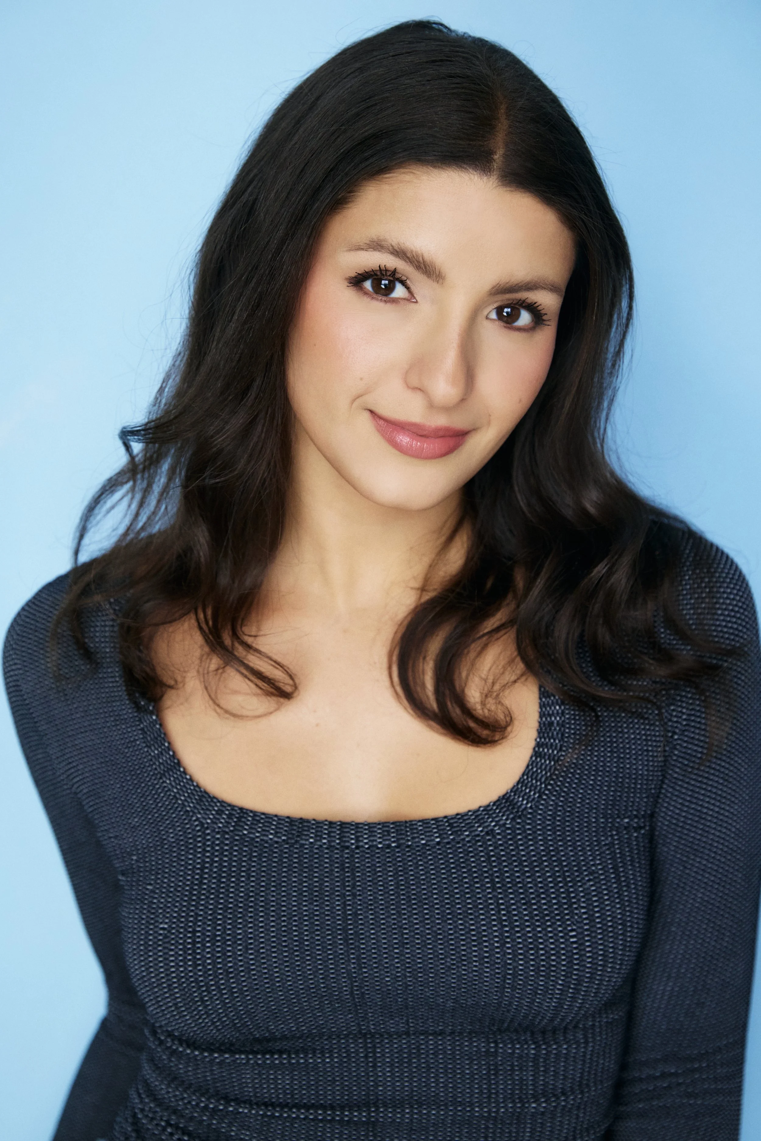 A young woman with dark brown wavy hair and light skin, wearing a fitted royal blue shirt, looking confidently at the camera against a plain gray background.