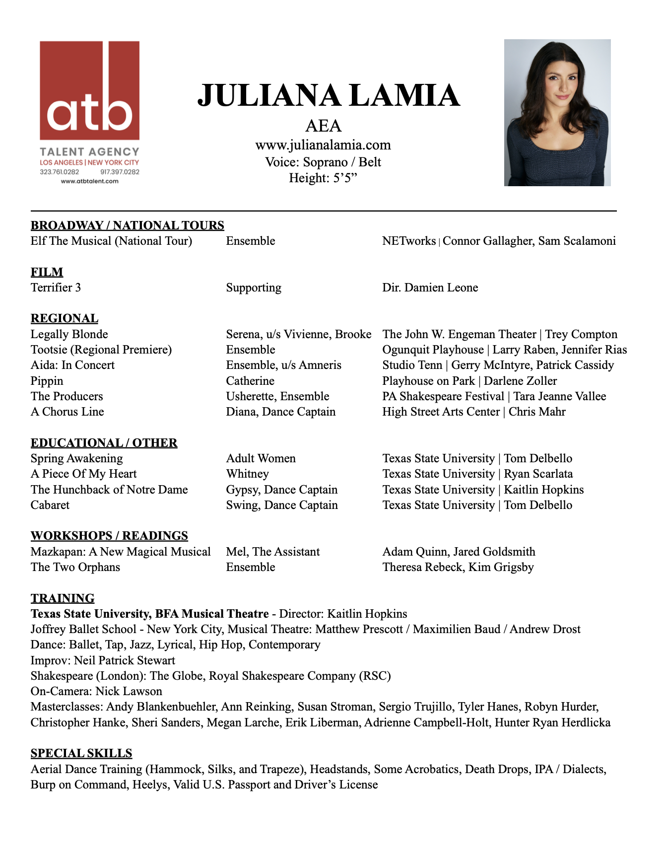 A theatrical resume for Juliana Lamia featuring her photo, contact info, and list of performances, including Broadway, regional, educational, workshops, training, and skills.