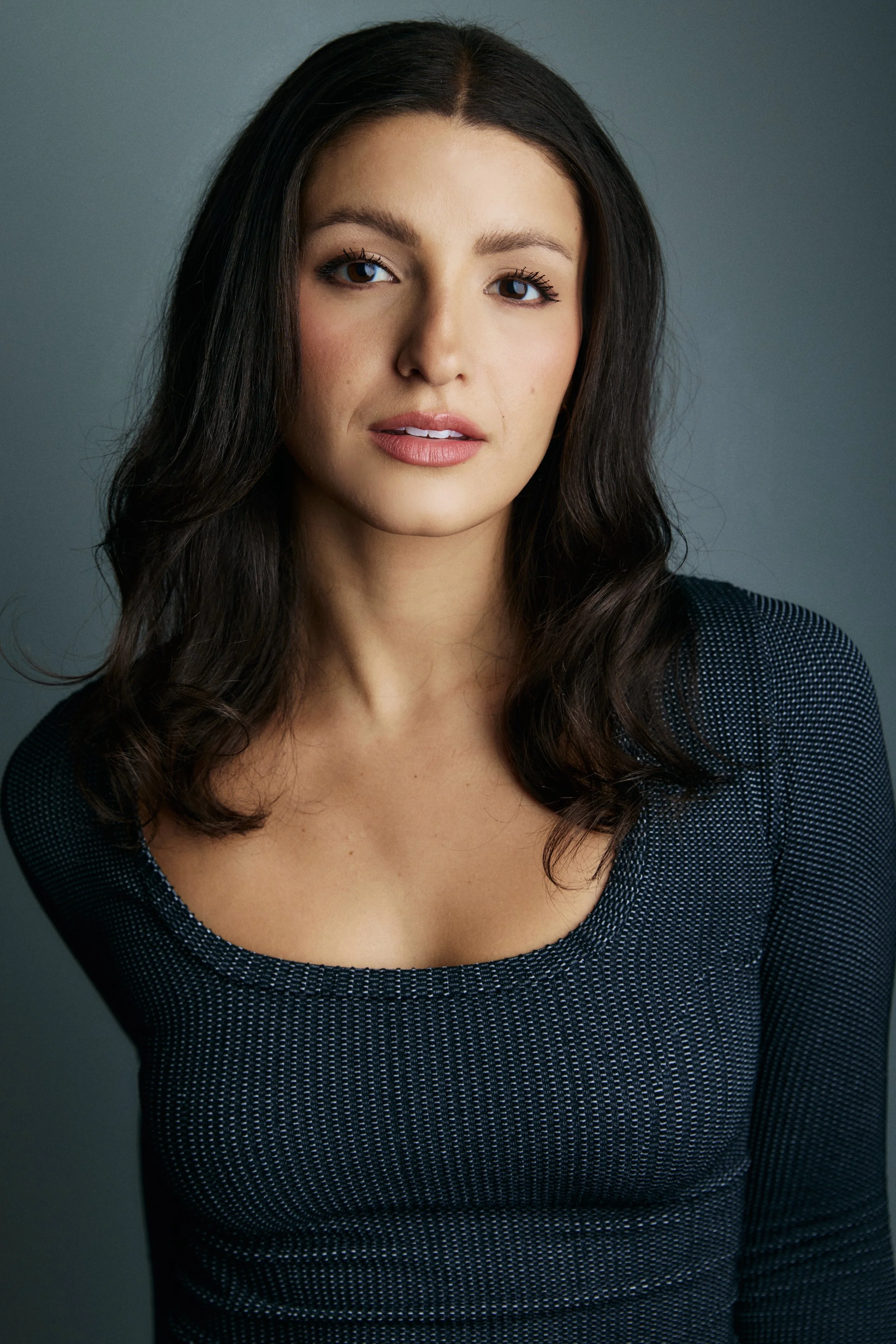 Portrait of a young woman with dark brown hair, wearing a black leather jacket and a white top, against a gray background.